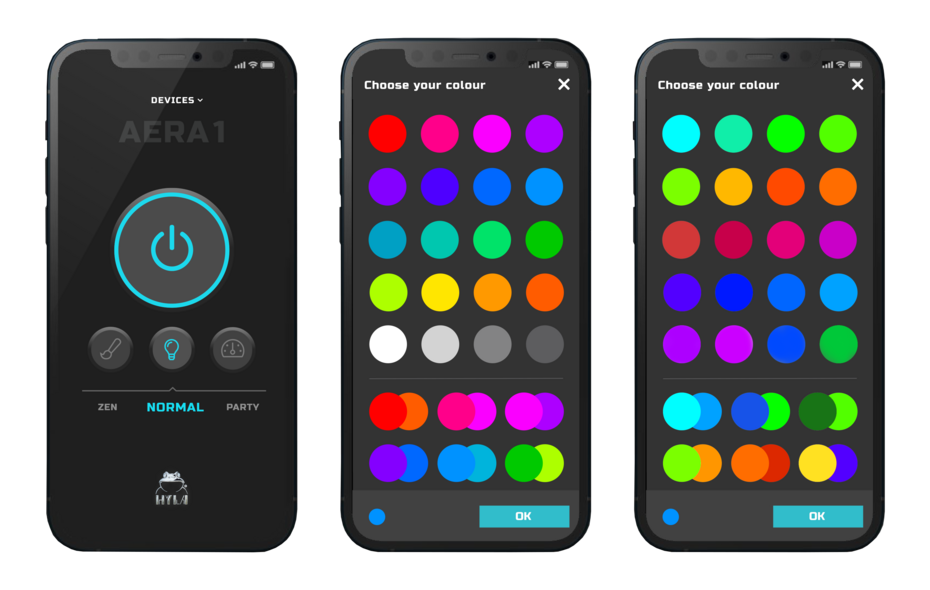 Der neue HYLA AERA wird über das Smartphone bedient. Sie können Ihr Smartphone über Bluetooth® mit der HYLA AERA App (verfügbar für iOS und Android Handys) verbinden. Mit der HYLA AERA App können Sie aus Millionen von Farben wählen und Ihre eigene Lichttherapie erschaffen. Der neue HYLA AERA erfrischt die Luft in Ihrem Zuhause und dem Ihrer Familie durch einen sanften Wassernebel, indem er schlechte Gerüche neutralisiert und Bakterien sowie Luftschadstoffe reduziert.